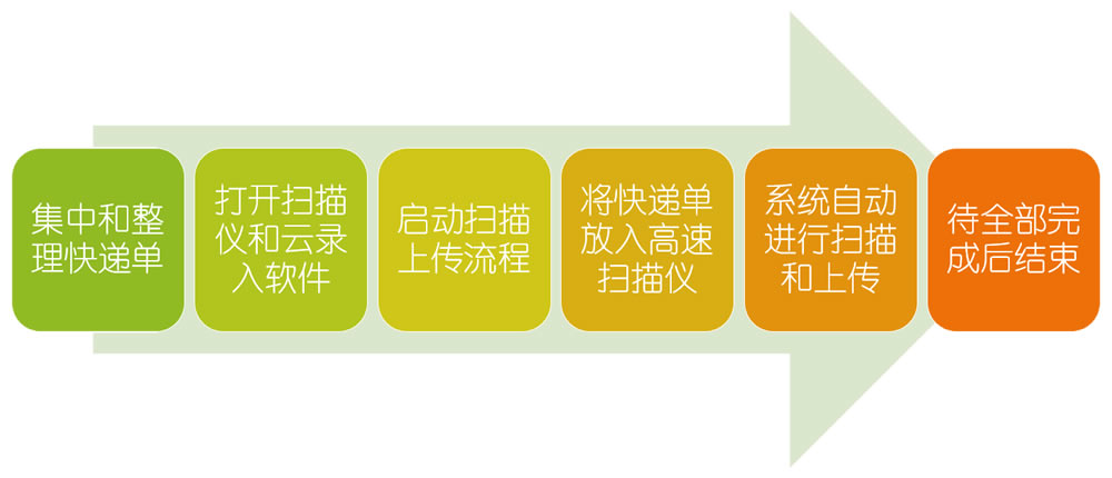 作为针对物流快递行业的高效数据录入解决方案系列之一,该方案是在每个网点中部署一台高速扫描仪,每天统一时段(如16点)将快递员收集的面单通过高速扫描仪扫描并自动上传到云录入平台中进行录入工作。录入结束并确认无误后提交到总部的数据中心。该方案拥有以下优势: